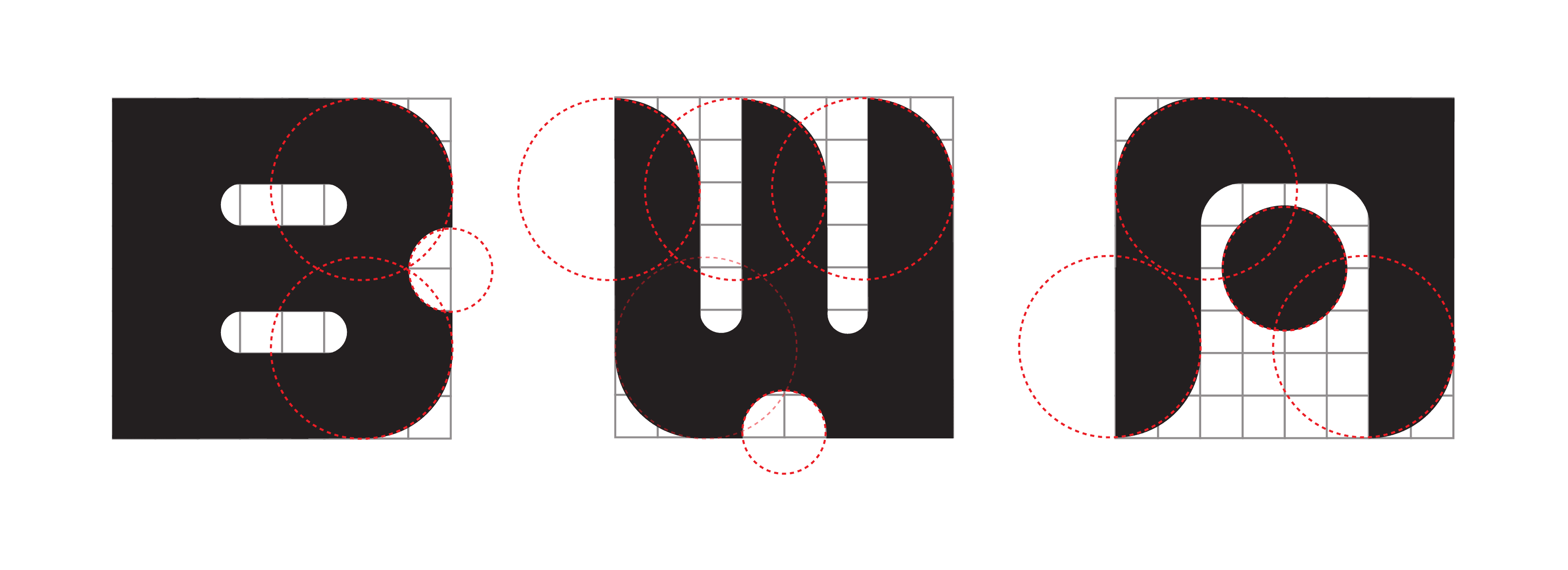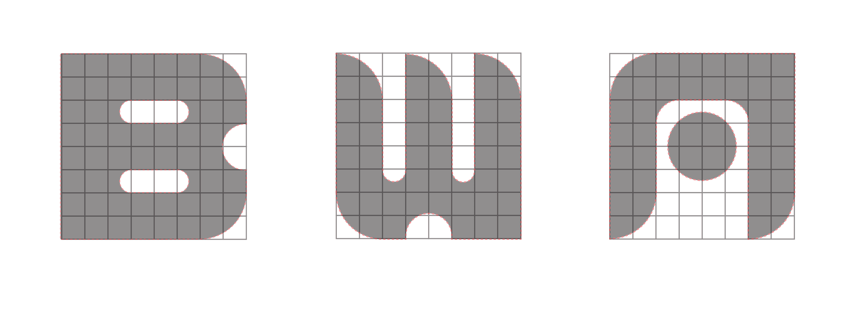 To keep the letterforms cohesive, an 8x8 grid system was first established before the development process. Inspired by Bauhaus design, shapes adhered to basic geometric shapes, notably varying degrees of circles when defining curves and strokes. Through a balanced use of sharp and rounded edges, a sleek futuristic typeface was adopted.