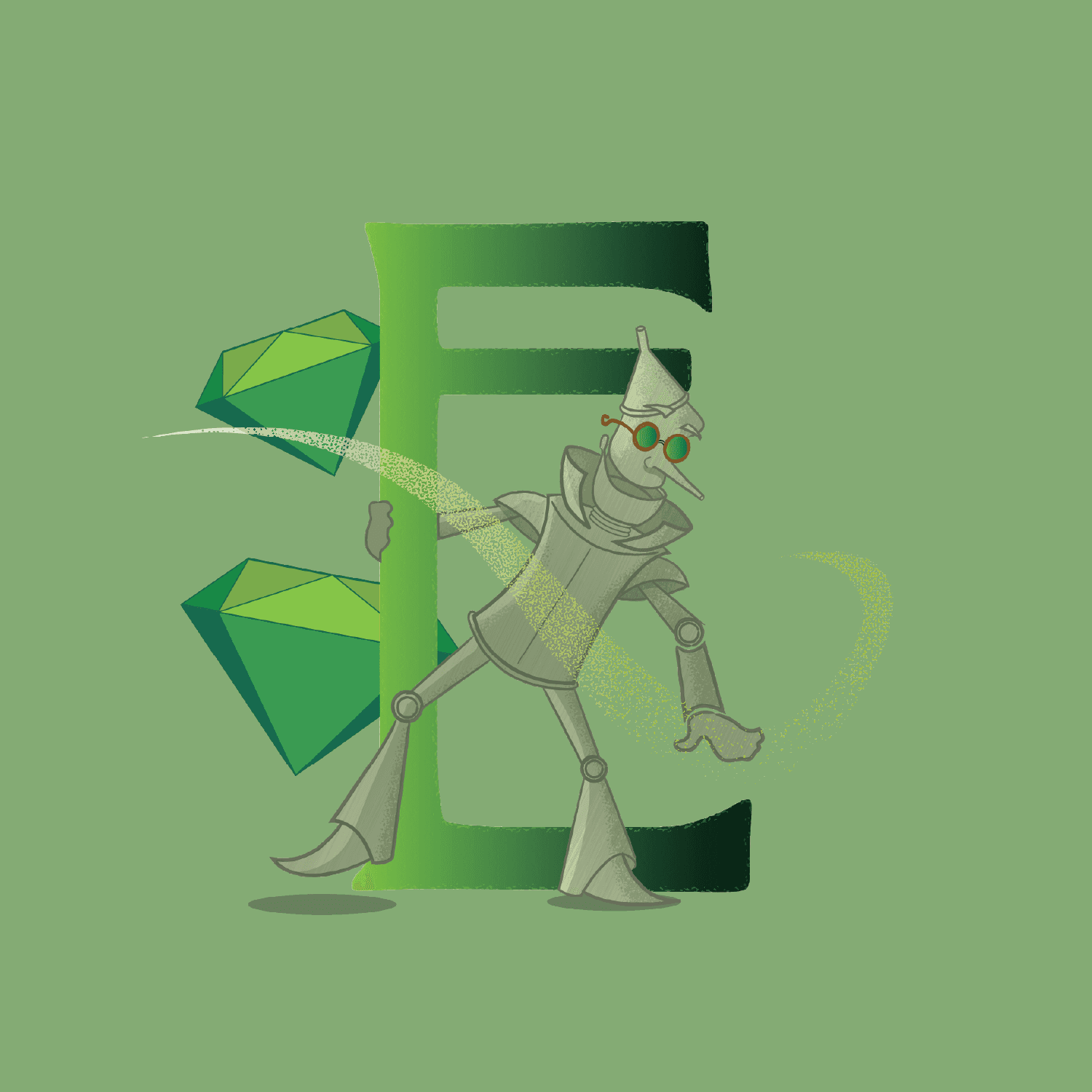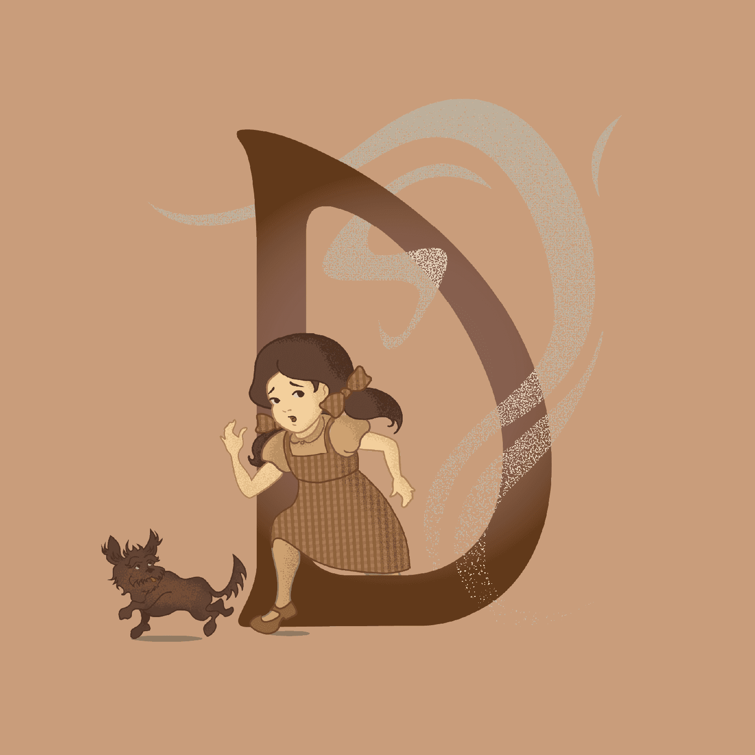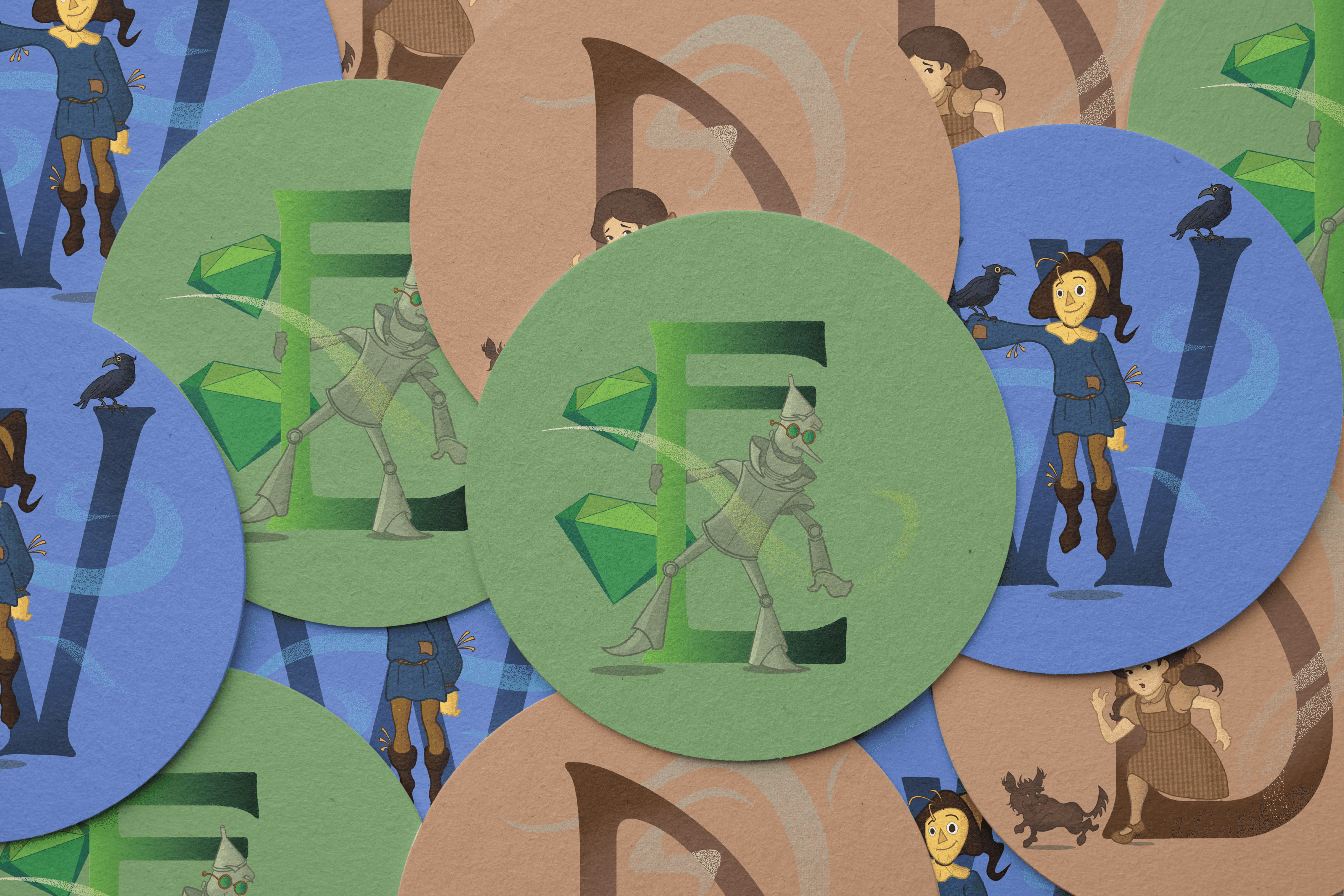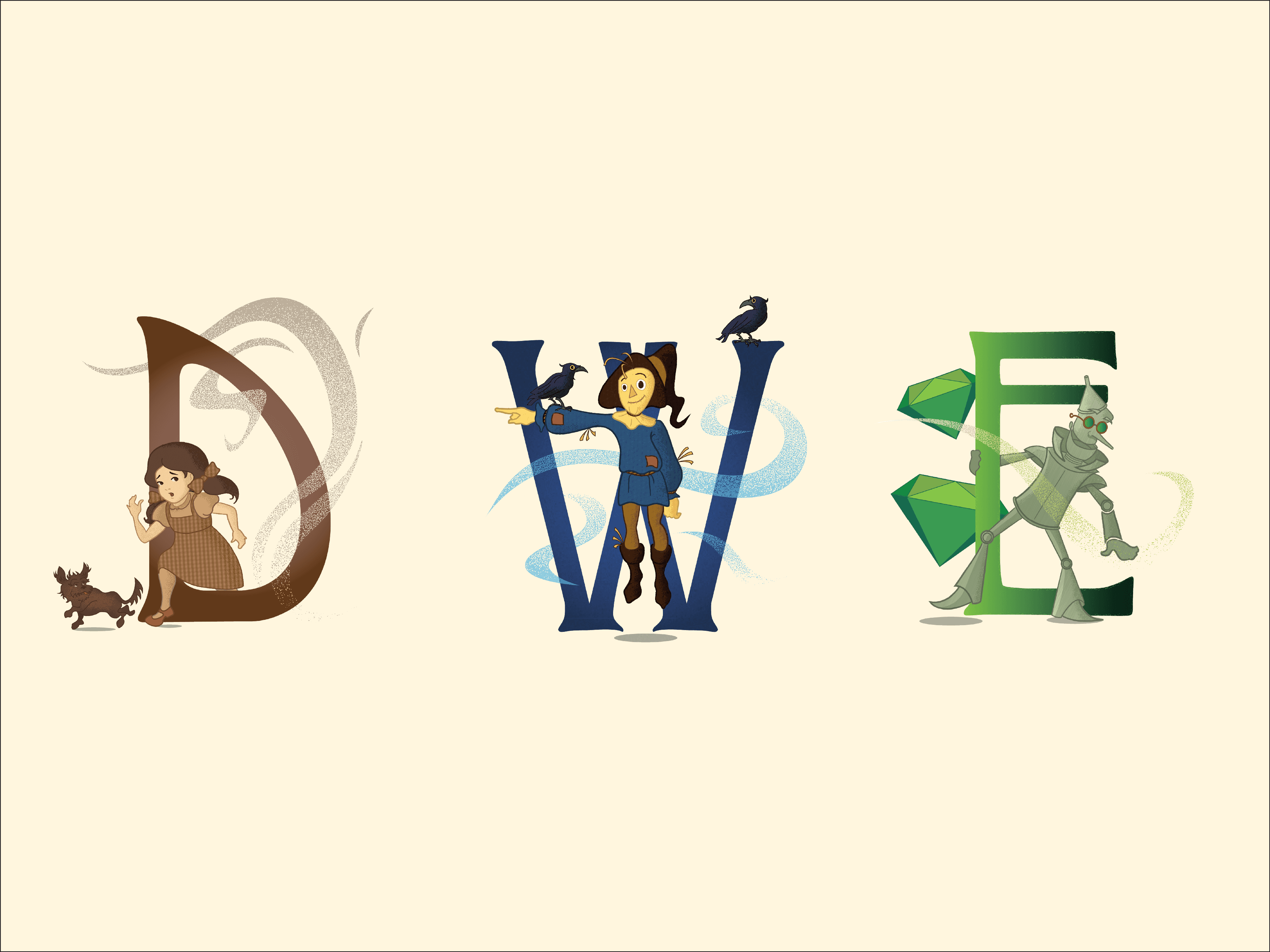 By adopting a monochromatic treatment to the final drop caps, a consistent style was established to bring unison to the letters. Each drop cap incorporates a character in addition to a secondary element that builds another layer of dimension. Through the selection of an appropriate typeface accompanied by a stylistic illustration treatment, the final designs embody a timelessness that exists within a story like The Wonderful Wizard of Oz.